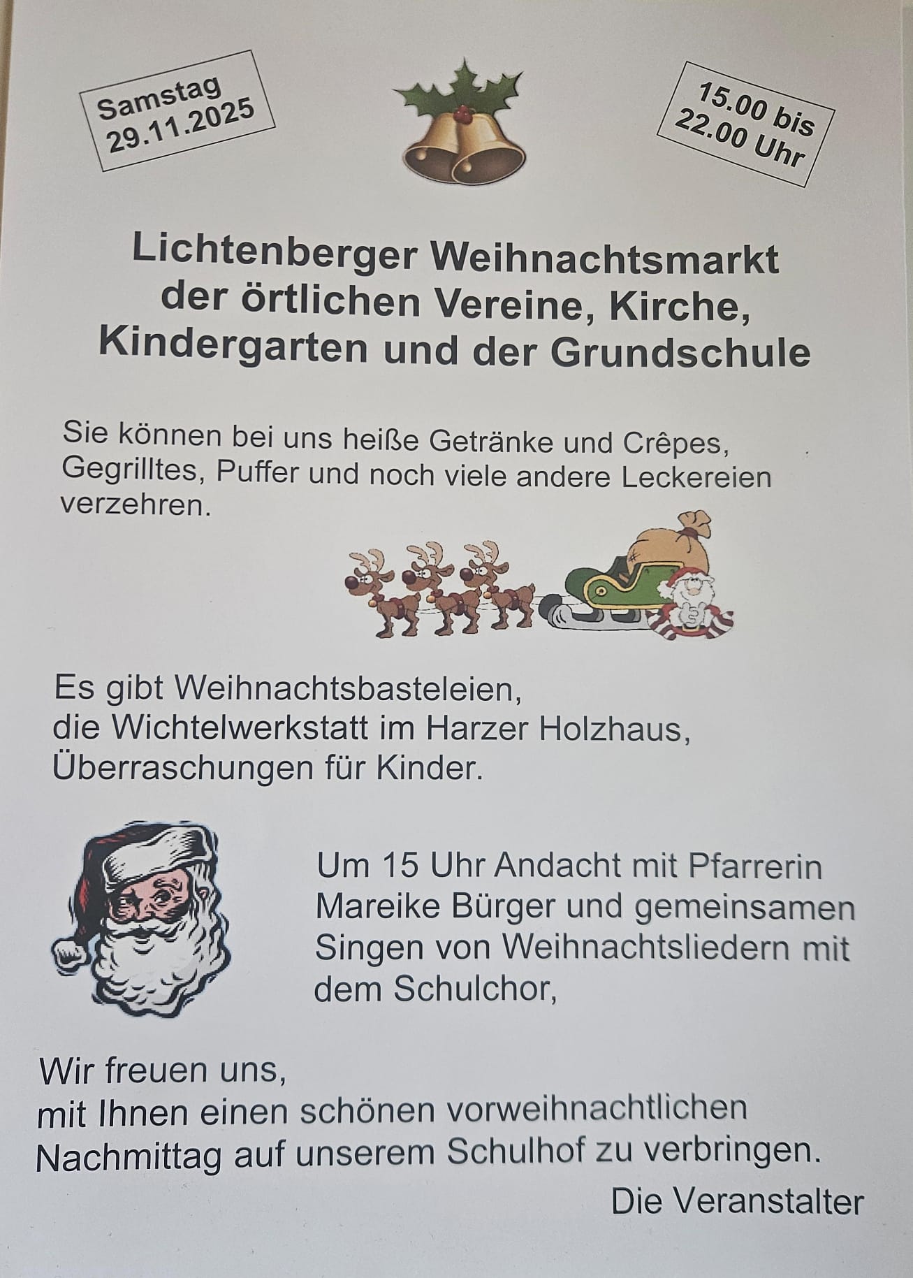 Lichtenberger Weihnachtsmarkt am Samstag, dem 29. November 2025. Es werden fleißiger Helfer zum Aufbau, Abbau und für den Getränkewagen gesucht. Bitte meldet Euch an: kontakt@heimatkreis-lichtenberg.de